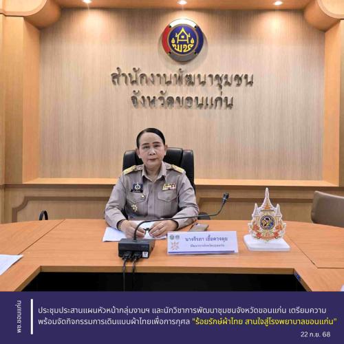 พช.ขอนแก่น : ประชุมประสานแผนหัวหน้ากลุ่มงานฯ และนักวิชาการพัฒนาชุมชนจังหวัดขอนแก่น เตรียมความพร้อมจัดกิจกรรมการเดินแบบผ้าไทยเพื่อการกุศล "ร้อยรักษ์ผ้าไทย สานใจสู่โรงพยาบาลขอนแก่น"
