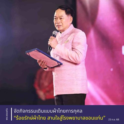 ** จังหวัดขอนแก่น ร่วมกับภาคราชการและภาคเอกชน จัดกิจกรรมเดินแบบผ้าไทยการกุศล “ร้อยรักษ์ผ้าไทย สานใจสู่โรงพยาบาลขอนแก่น” โดยมี นายไกรสร กองฉลาด ผู้ว่าราชการจังหวัดขอนแก่น เป็นประธานเปิดงาน พร้อมด้วย นายศิริวัฒน์ พินิจพานิชย์ รองผู้ว่าราชการจังหวัดขอนแก่น นายประจวบ รักแพทย์ รองผู้ว่าราชการจังหวัดขอนแก่น นางกรรณิกา กองฉลาด นายกเหล่ากาชาดจังหวัดขอนแก่น และแขกผู้มีเกียรติจากหลายภาคส่วนเข้าร่วมอย่างคับคั่ง