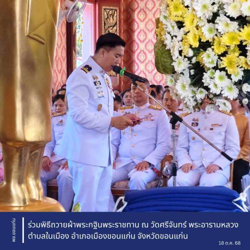 ** พิธีถวายพระกฐินพระราชทานตามที่ พระบาทสมเด็จพระเจ้าอยู่หัว ทรงพระกรุณาโปรดเกล้าฯ พระราชทาน ผ้าพระกฐินพร้อมเครื่องบริวารพระกฐิน เพื่อให้น้อมนำไปถวายพระสงฆ์ที่จำพรรษาครบไตรมาส ณ วัดศรีจันทร์ พระอารามหลวง ตำบลในเมือง อำเภอเมืองขอนแก่น จังหวัดขอนแก่น