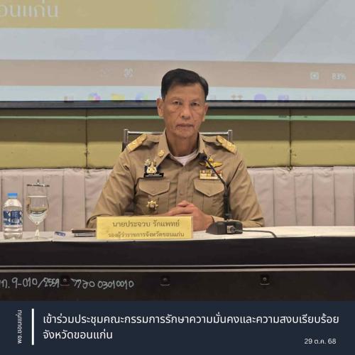 ** นายชรินทร์ ทองสุข ผู้ว่าราชการจังหวัดขอนแก่น มอบหมายให้ นายประจวบ รักแพทย์ รองผู้ว่าราชการจังหวัดขอนแก่น เป็นประธานการประชุมคณะกรรมการรักษาความมั่นคงและความสงบเรียบร้อยจังหวัดขอนแก่น ครั้งที่ 10/2568 พร้อมด้วย คณะกรรมการมั่งคงและความสงบเรียบร้อยจังหวัดขอนแก่น