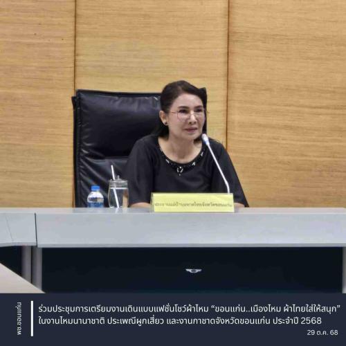 ** นายชรินทร์ ทองสุข ผู้ว่าราชการจังหวัดขอนแก่น มอบหมายให้ นางสินีนาฏ ทองสุข นายกเหล่ากาชาดจังหวัดขอนแก่นและประธานแม่บ้านมหาดไทยจังหวัดขอนแก่น เป็นประธานการประชุมการเตรียมงานเดินแบบแฟชั่นโชว์ผ้าไหม “ขอนแก่น..เมืองไหม ผ้าไทยใส่ให้สนุก” ในงานไหมนานาชาติ ประเพณีผูกเสี่ยว และงานกาชาดจังหวัดขอนแก่น ประจำปี 2568 พร้อมด้วย คณะกรรมการการจัดงานฯ ที่จะจัดขึ้น ณ เวทีกลาง บริเวณหน้าศาลากลางจังหวัดขอนแก่น อำเภอเมืองขอนแก่น จังหวัดขอนแก่น โดยในที่ประชุมฯ ได้สรุปชื่องานเป็น “วิจิตรา ผ้าไหมไทย ร้อยดวงใจ ถวายอาลัย พระพันปีหลวง”