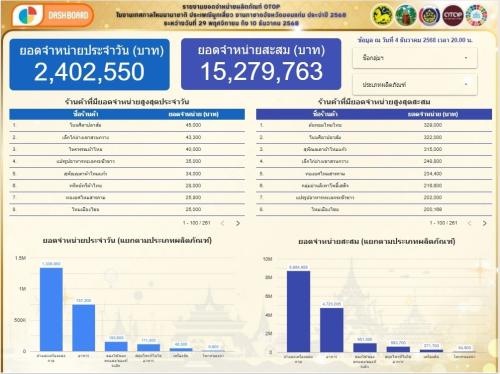 ** ประจำวันที่ 4 ธันวาคม 2568 ยอดจำ ยอดจำหน่ายประจำวัน 2,402,550 บาท ยอดจำหน่ายสะสม 5 วัน 15,279,763 บาทร้านค้าที่มียอดจำหน่ายสูงสุด 5 ลำดับ