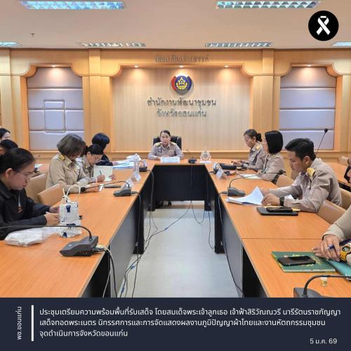 ** นางจิรภา เชื้อดวงผุย พัฒนาการจังหวัดขอนแก่น พร้อมด้วย นางสาวพัชรา วงศ์สุวรรณ ผู้อำนวยการกลุ่มงานส่งเสริมการพัฒนาชุมชน นางมาลินี เมตตันตคุปต์ ผู้อำนวยการกลุ่มงานยุทธศาสตร์การพัฒนาชุมชน นางจันทิรา นัดทะยาย ผู้อำนวยการกลุ่มงานประสานและสนับสนุนการบริหารงานพัฒนาชุมชน ผู้ช่วยกลุ่มงานส่งเสริมการพัฒนาชุมชน ผู้ช่วยกลุ่มงานสารสนเทศการพัฒนาชุมชน และเจ้าหน้าที่พัฒนาชุมชนจังหวัดขอนแก่น จัดประชุมเตรียมความพร้อมพื้นที่รับเสด็จ โดยสมเด็จพระเจ้าลูกเธอ เจ้าฟ้าสิริวัณณวรี นารีรัตนราชกัญญา เสด็จทอดพระเนตร นิทรรศการและการจัดแสดงผลงานภูมิปัญญาผ้าไทยและงานหัตถกรรมชุมชน จุดดำเนินการจังหวัดขอนแก่น ในวันที่ 21 มกราคม 2569 ณ มหาวิทยาลัยขอนแก่น ตำบลในเมือง อำเภอเมืองขอนแก่น จังหวัดขอนแก่น