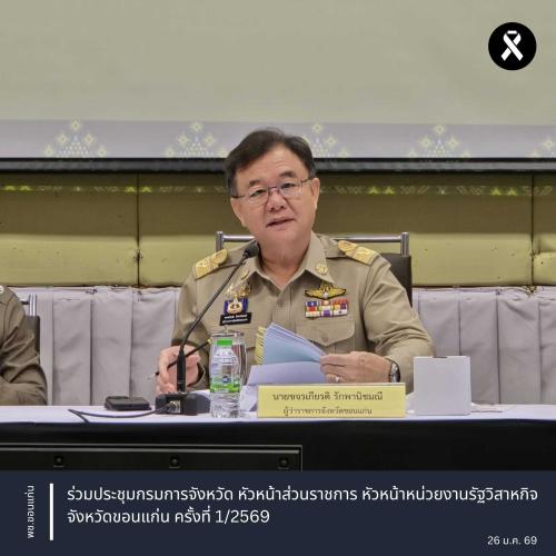 ** นายขจรเกียรติ รักพานิชมณี ผู้ว่าราชการจังหวัดขอนแก่น เป็นประธานการเข้าร่วมประชุมกรรมการ หัวหน้าส่วนราชการจังหวัด ประจำเดือนมกราคม 2569 โดยมี รองผู้ว่าราชการจังหวัดขอนแก่น นายอำเภอ หัวหน้าส่วนราชการในสังกัดกระทรวงมหาดไทย เข้าร่วมประชุม ณ ห้องประชุมแก่นเมือง ชั้น 1 ศาลากลางจังหวัดขอนแก่น