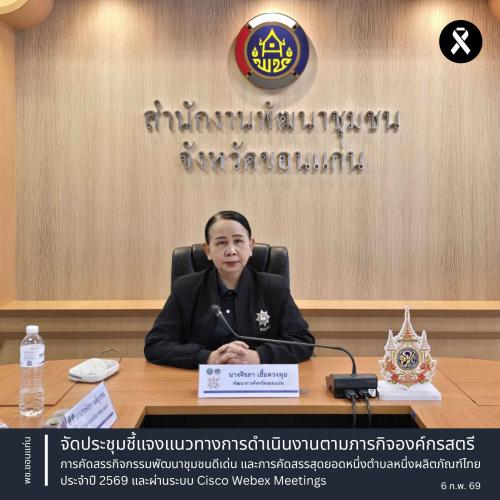 ** นางจิรภา เชื้อดวงผุย พัฒนาการจังหวัดขอนแก่น เป็นประธานเปิดการประชุมชี้แจงแนวทางการดำเนินงานตามภารกิจองค์กรสตรี การคัดสรรกิจกรรมพัฒนาชุมชนดีเด่น และการคัดสรรสุดยอดหนึ่งตำบลหนึ่งผลิตภัณฑ์ไทย ประจำปี 2569 ผ่านระบบ Cisco Webex Meetings พร้อมด้วย นางสาวพัชรา วงศ์สุวรรณ ผู้อำนวยการกลุ่มงานส่งเสริมการพัฒนาชุมชน และเจ้าหน้าที่กลุ่มงานส่งเสริมการพัฒนาชุมชน เข้าร่วมประชุมชี้แจงในครั้งนี้
