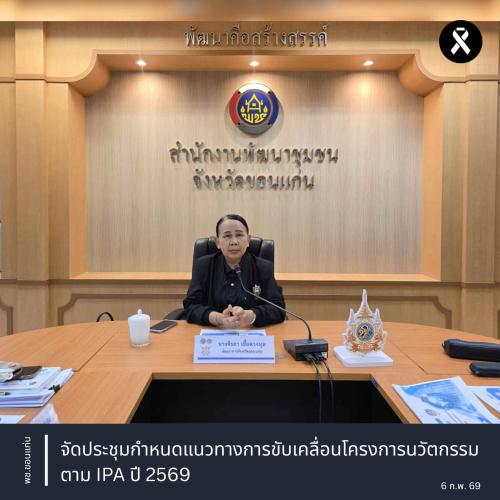 ** นางจิรภา เชื้อดวงผุย พัฒนาการจังหวัดขอนแก่น เป็นประธานการประชุมกำหนดแนวทางการขับเคลื่อนโครงการนวัตกรรม ตาม IPA ปี 2569 พร้อมด้วย นางสาวพัชรา วงศ์สุวรรณ ผู้อำนวยการกลุ่มงานส่งเสริมการพัฒนาชุมชน นางมาลินี เมตตันตคุปต์ ผู้อำนวยการกลุ่มงานยุทธศาสตร์การพัฒนาชุมชน นางจันทิรา นัดทะยาย ผู้อำนวยการกลุ่มงานประสานและสนับสนุนการบริหารงานพัฒนาชุมชน ผู้ช่วยกลุ่มงานส่งเสริมการพัฒนาชุมชน ผู้ช่วยกลุ่มงานสารสนเทศการพัฒนาชุมชน และเจ้าหน้าที่พัฒนาชุมชนจังหวัดขอนแก่น เข้าร่วมประชุมฯ ในครั้งนี้ด้วย