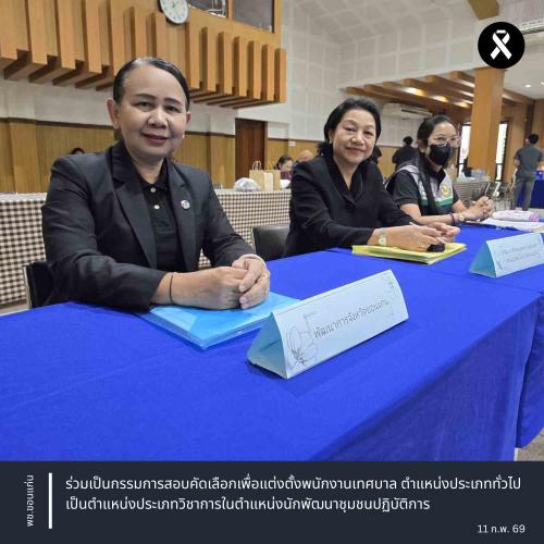 พช.ขอนแก่น : ร่วมเป็นกรรมการสอบคัดเลือกเพื่อแต่งตั้งพนักงานเทศบาล ตำแหน่งประเภททั่วไป เป็นตำแหน่งประเภทวิชาการในตำแหน่งนักพัฒนาชุมชนปฏิบัติการ