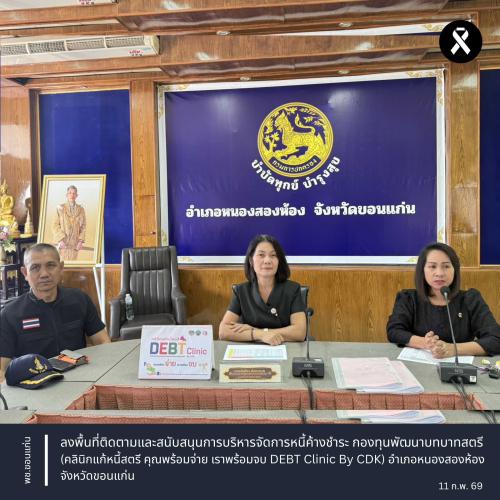 ** นางจันทิรา นัดทะยาย ผู้อำนวยการกลุ่มงานประสานและสนับสนุนการบริหารงานพัฒนาชุมชน พร้อมด้วย ผู้ทรงคุณวุฒิคณะอนุกรรมการบริหารกองทุนพัฒนาบทบาทสตรีจังหวัดขอนแก่น นางจิรสุภา สมบัติธนดล พัฒนาการอำเภอหนองสองห้อง และเจ้าหน้าที่พัฒนาชุมชนอำเภอหนองสองห้อง และเจ้าหน้าที่กองทุนพัฒนาบทบาทสตรีจังหวัดขอนแก่น ลงพื้นที่ติดตามและสนับสนุนการดำเนินงานด้านการบริหารจัดการหนี้ค้างเกินกำหนดชำระของกองทุนพัฒนาบทบาทสตรี ภายใต้กิจกรรม “คลินิกแก้หนี้สตรี คุณพร้อมจ่าย เราพร้อมจบ (DEBT Clinic By CDK)” ร่วมกับสำนักงานพัฒนาชุมชนอำเภอหนองสองห้อง