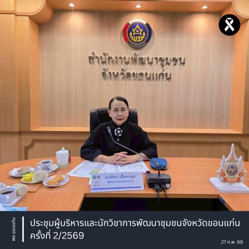 ** นางจิรภา เชื้อดวงผุย พัฒนาการจังหวัดขอนแก่น เป็นประธานการประชุมผู้บริหารและนักวิชาการพัฒนาชุมชนจังหวัดขอนแก่น ครั้งที่ 2/2569 (ประจำเดือนกุมภาพันธ์) เพื่อติดตามผลการดำเนินงานและประสานการขับเคลื่อนภารกิจงานพัฒนาชุมชนในทุกมิติ พร้อมด้วยผู้อำนวยการกลุ่มงาน พัฒนาการอำเภอทั้ง 26 อำเภอ และเจ้าหน้าที่พัฒนาชุมชนจังหวัดขอนแก่น เข้าร่วมประชุม ณ ห้องประชุมสำนักงานพัฒนาชุมชนจังหวัดขอนแก่น ชั้น 2 ศาลากลางจังหวัดขอนแก่น