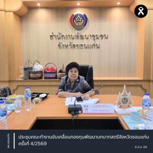 ** นางจิรภา เชื้อดวงผุย พัฒนาการจังหวัดขอนแก่น มอบหมายให้ นางจันทิรา นัดทะยาย ผู้อำนวยการกลุ่มงานประสานและสนับสนุนการบริหารงานพัฒนาชุมชน และเจ้าหน้าที่กองทุนพัฒนาสตรีจังหวัดขอนแก่น ร่วมประชุมคณะทำงานขับเคลื่อนกองทุนพัฒนาบทบาทสตรีจังหวัดขอนแก่น ครั้งที่ 4/2569 โดยมีนางทัศนีย์ ศรีโสภา หัวหน้าคณะทำงานขับเคลื่อนฯ จังหวัดขอนแก่น เป็นประธานการประชุมฯ พร้อมคณะทำงานขับเคลื่อนกองทุนฯ จังหวัดขอนแก่น