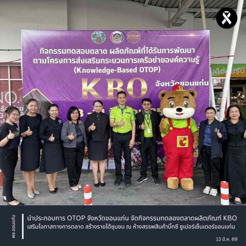 ** นางจิรภา เชื้อดวงผุย พัฒนาการจังหวัดขอนแก่น พร้อมด้วย นางสาวพัชรา วงศ์สุวรรณ ผู้อำนวยการกลุ่มงานส่งเสริมการพัฒนาชุมชน นางมาลินี เมตตันตคุปต์ ผู้อำนวยการกลุ่มงานยุทธศาสตร์การพัฒนาชุมชน นางจันทรนันท์ สุดจริง ผู้อำนวยการกลุ่มงานสารสนเทศการพัฒนาชุมชน และเจ้าหน้าที่พัฒนาชุมชนจังหวัดขอนแก่น นำกลุ่มผู้ผลิต ผู้ประกอบการ OTOP เข้าร่วมกิจกรรมการทดลองตลาดผลิตภัณฑ์ที่ได้รับการพัฒนา ภายใต้โครงการส่งเสริมกระบวนการเครือข่ายองค์ความรู้ (Knowledge – Based OTOP : KBO) จังหวัดขอนแก่น ประจำปีงบประมาณ พ.ศ. 2569 เพื่อส่งเสริมศักยภาพเครือข่ายองค์ความรู้ KBO จังหวัด ให้เป็นศูนย์กลางในการให้ความช่วยเหลือและสนับสนุนการพัฒนาขีดความสามารถของผู้ผลิต ผู้ประกอบการ OTOP ในการยกระดับผลิตภัณฑ์ให้มีคุณภาพ มาตรฐาน มีมูลค่าเพิ่ม และสร้างสรรค์นวัตกรรม