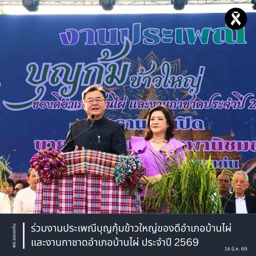 ** นายขจรเกียรติ รักพานิชมณี ผู้ว่าราชการจังหวัดขอนแก่น เป็นประธานในพิธีเปิดงานประเพณีบุญกุ้มข้าวใหญ่ของดีอำเภอบ้านไผ่ และงานกาชาดอำเภอบ้านไผ่ ประจำปี 2569 พร้อมด้วย นางปิติมา รักพานิชมณี ประธานแม่บ้านมหาดไทยขอนแก่นโดยมี นายเสกสม ลินดาพรประเสริฐ กล่าวรายงานวัตถุประสงค์การจัดงาน พร้อมด้วย หัวหน้าส่วนราชการอำเภอบ้านไผ่ นางสาววาสนา แก้วนา พัฒนาการอำเภอบ้านไผ่ และเจ้าหน้าที่พัฒนาชุมชนอำเภอบ้านไผ่ ให้การต้อนรับ อีกทั้ง ภาคเอกชน องค์กรปกครองส่วนท้องถิ่น และประชาชนร่วมงานเป็นจำนวนมาก