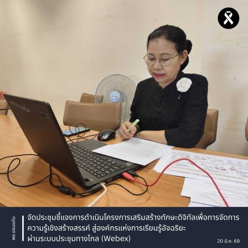 ** นางจิรภา เชื้อดวงผุย พัฒนาการจังหวัดขอนแก่น พร้อมด้วยนางจันทรนันท์ สุดจริง ผู้อำนวยการกลุ่มงานสารสนเทศการพัฒนาชุมชน และนางสาวจันทิมา ล่ามแขก นักวิชาการพัฒนาชุมชนชำนาญการ จัดประชุมชี้แจงการดำเนินโครงการเสริมสร้างทักษะดิจิทัลเพื่อการจัดการความรู้เชิงสร้างสรรค์ สู่องค์กรแห่งการเรียนรู้อัจฉริยะ ผ่านระบบประชุมทางไกล (Webex) เพื่อสร้างความรู้ความเข้าใจเกี่ยวกับแนวทางการดำเนินโครงการ และการนำเทคโนโลยีดิจิทัลมาประยุกต์ใช้ในการจัดการองค์ความรู้
