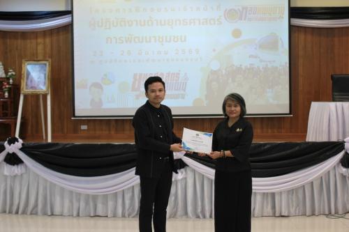 นายสยาม สิริมงคล อธิบดีกรมการพัฒนาชุมชน ได้มอบหมายให้นางสาวมนทิรา เข็มทอง ผู้ตรวจราชการกรมการพัฒนาชุมชน เป็นประธานในการมอบใบประกาศนียบัตรแก่ผู้เขเารับการอบรมและกล่าวปิดการฝึกอบรม
