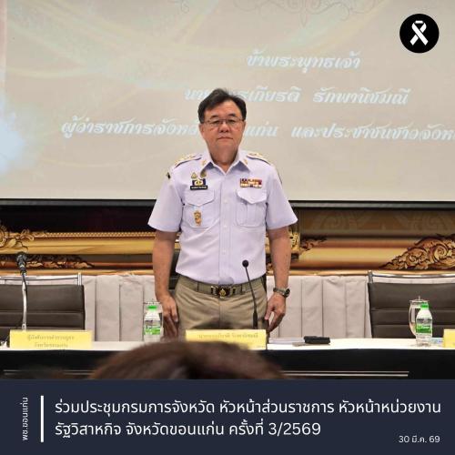 ** นายขจรเกียรติ รักพานิชมณี ผู้ว่าราชการจังหวัดขอนแก่น เป็นประธานการเข้าร่วมประชุมกรรมการ หัวหน้าส่วนราชการจังหวัด ประจำเดือนมีนาคม 2569 โดยมี รองผู้ว่าราชการจังหวัดขอนแก่น นายอำเภอ หัวหน้าส่วนราชการในสังกัดกระทรวงมหาดไทย เข้าร่วมประชุม ณ ห้องประชุมแก่นเมือง ชั้น 1 ศาลากลางจังหวัดขอนแก่น
