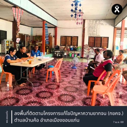 ** นางจิรภา เชื้อดวงผุย พัฒนาการจังหวัดขอนแก่น มอบหมายให้ นายอภิสิทธิ์ มาตย์วังแสง และนางเมทินี ศรีโคตร เจ้าหน้าที่พัฒนาชุมชนอำเภอเมืองขอนแก่น ลงพื้นที่ติดตามการดำเนินงานโครงการแก้ไขปัญหาความยากจน (กข.คจ.) บ้านหนองกุงน้อย ม.12 ต. บ้านค้อ อ.เมืองขอนแก่น จ.ขอนแก่น พร้อมด้วยคณะกรรมการ กข.คจ. และสมาชิก