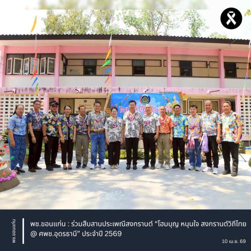 ** สำนักงานพัฒนาชุมชนจังหวัดขอนแก่น นำโดย นางจิรภา เชื้อดวงผุย พัฒนาการจังหวัดขอนแก่น พร้อมด้วยผู้อำนวยการกลุ่มงาน พัฒนาการอำเภอภูเวียง และเจ้าหน้าที่พัฒนาชุมชนจังหวัดขอนแก่น เข้าร่วมกิจกรรมงานสืบสานประเพณีรดน้ำขอพร เนื่องในเทศกาลสงกรานต์ ประจำปี 2569 ภายใต้ชื่องาน “10 เมษายน 2569 โฮมบุญ หนุนใจ สงกรานต์วิถีไทย @ ศพช.อุดรธานี”