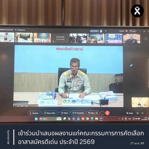 ** นายสงัด พืชพันธุ์ หัวหน้าผู้ตรวจราชการกรม ประธานในการประชุมคณะกรรมการการคัดเลือกอาสาสมัครดีเด่น ประจำปี 2569 โดยการประชุมมีวัตถุประสงค์เพื่อพิจารณาคัดเลือกผู้นำอาสาพัฒนาชุมชน (ผู้นำ อช.) ที่มีผลงานดีเด่น ประจำปี 2569 ของสมาคมสภาสังคมสงเคราะห์แห่งประเทศไทยในพระบรมราชูปถัมภ์ จำนวน 2 ราย ดำเนินการโดยให้ผู้นำอาสาพัฒนาชุมชน(ผู้นำอช.) ที่ผ่านการพิจารณาของคณะกรรมการกลั่นกรองอาสาสมัครดีเด่น ประจำปี 2569 ได้นำเสนอข้อมูลเพิ่มเติมแก่คณะกรรมการคัดเลือกอาสาสมัคร ประจำปี 2569 ผ่านระบบ Cisco Webex Meeting